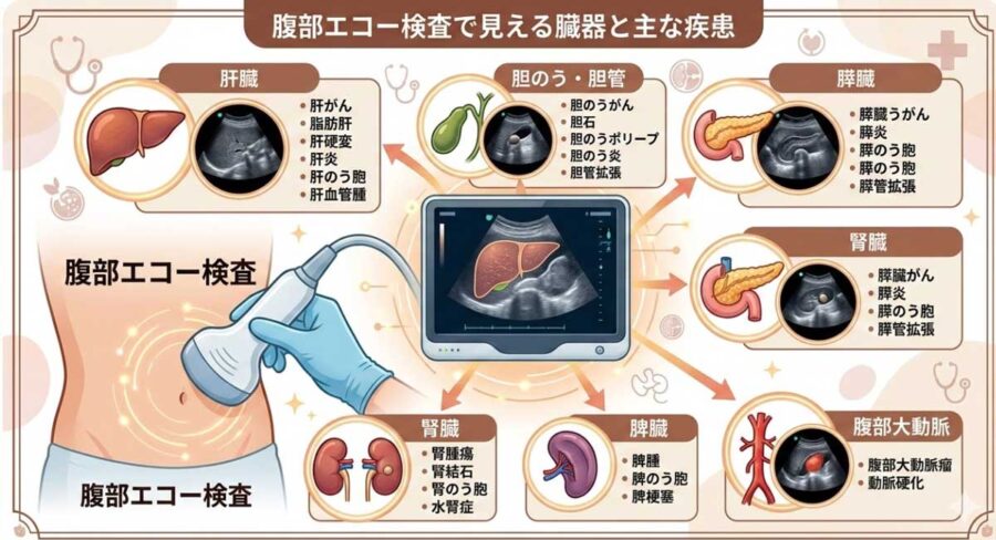 肝臓がん・膵臓がんなどは早期発見が難しいとされますが、定期的な腹部エコーで発見できることもあります。